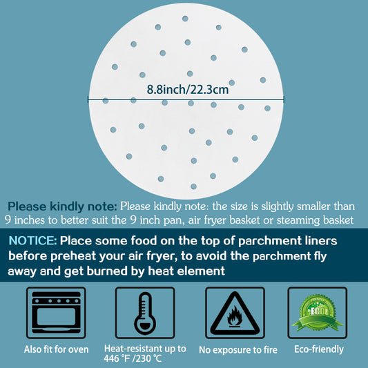 Perforated Air Fryer Parchment Paper, Set of 100, 9 Inch Bamboo Steamer Liners/Dumpling Steam Liner/Round Parchment Paper for Air Fryer, Steaming Basket and More