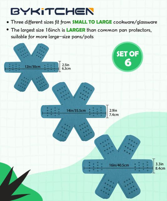 BYKITCHEN Pot Pan Protectors, Set of 6 & 3 Different Sizes, Felt Pot Protectors for Stacking, Cyan Pan Separators Protectors for Stacking and Protecting Your Cookware