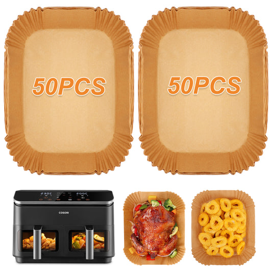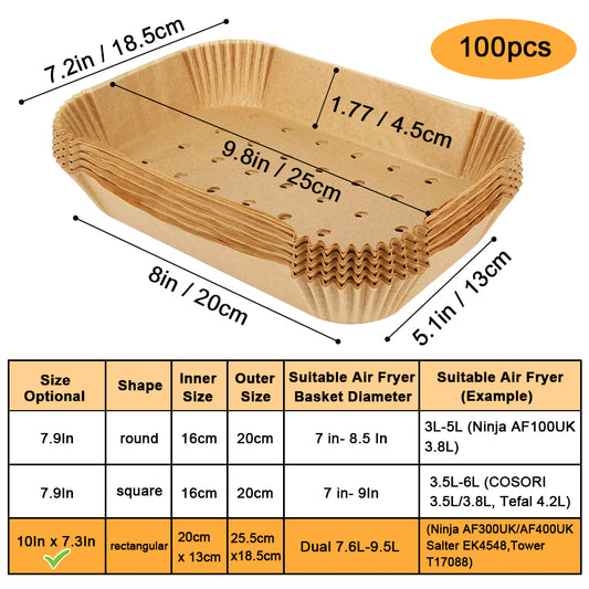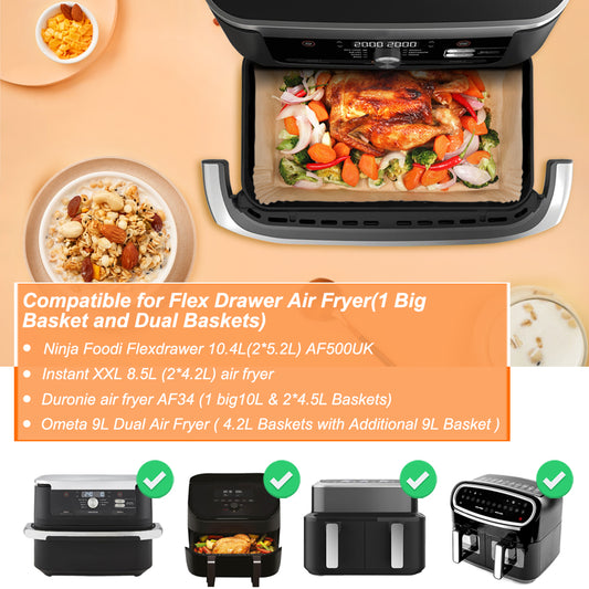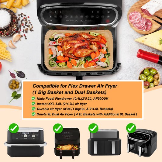BYKITCHEN Air Fryer Liners for COSORI Dual Air Fryer 8.5L, 100Pcs Air Fryer Accessories for Ninja Flex Drawer AF500UK, Compatible for Cuisinart XXL10.4L Air Fryer/Russell Hobbs Dual Air Fryer 9L