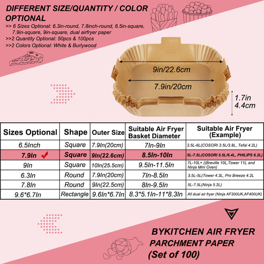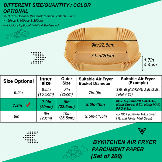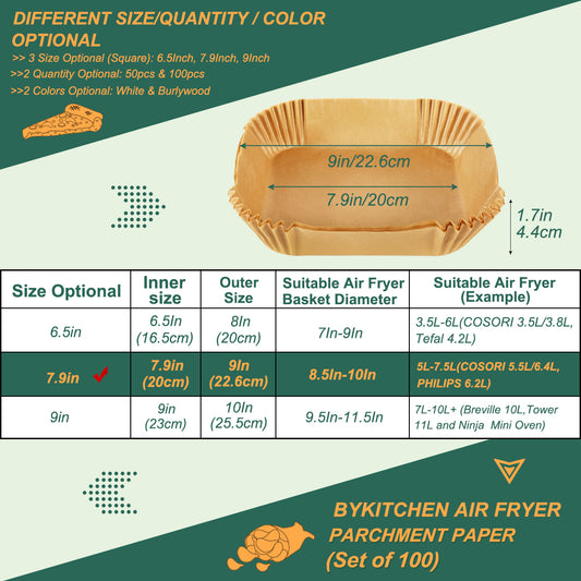 BYKITCHEN Air Fryer Liners Square, 100pcs 7.9 Inch Air Fryer Parchment Paper Liners Disposable, Large Greaseproof Paper for Air Fryer, Compatible with COSORI, Ninja, Tower Cosori (Unbleached)