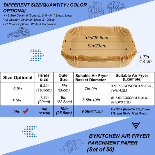 BYKITCHEN Air Fryer Paper Liners, 9 Inch Large Square Air Fryer Liners Disposable, Nonstick Air Fryer Parchment Paper Liners, Compatible with COSORI, Ninja, Tower (Unbleached, 50PCS)