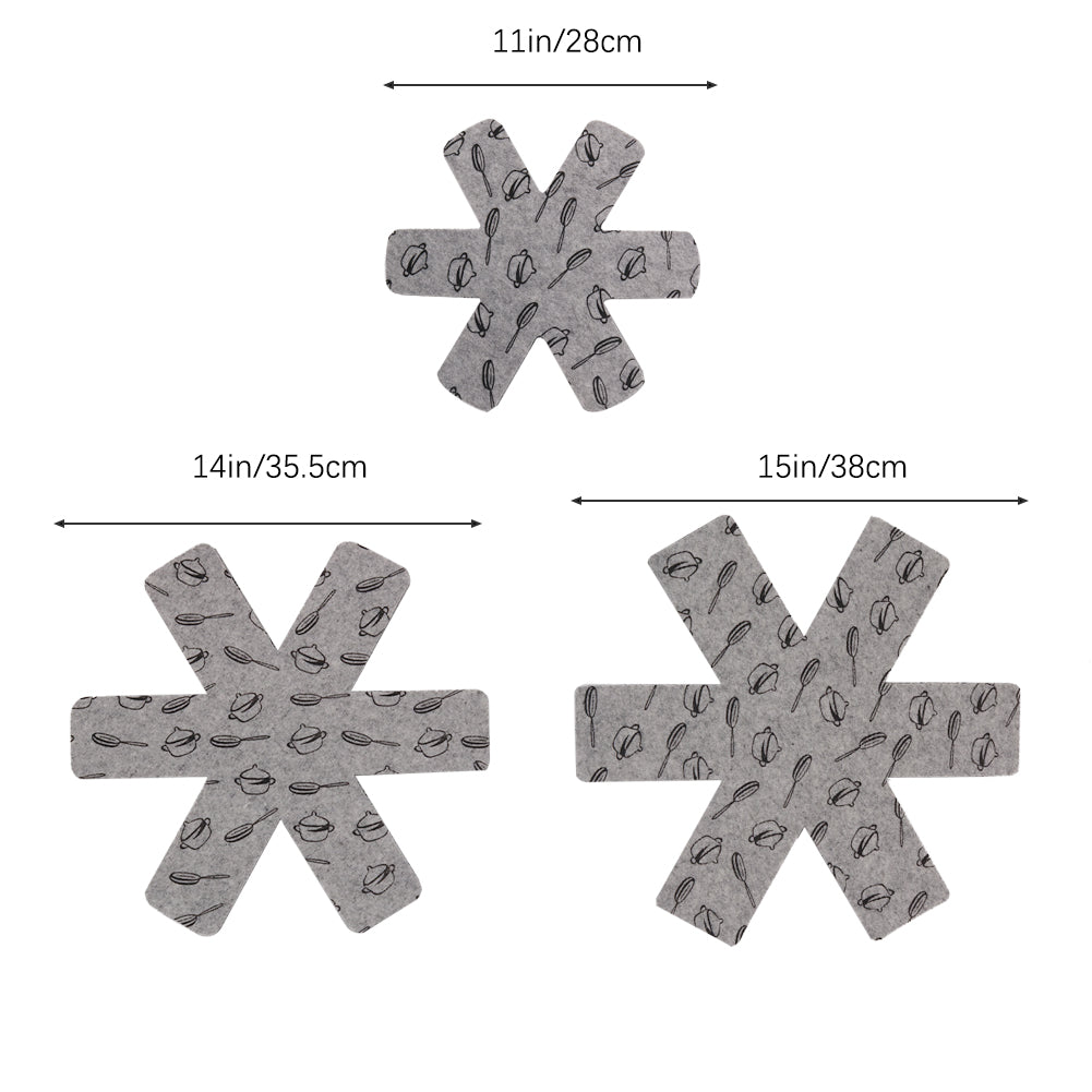 - Three Different Size: Perfect set of 12 felt pot protectors for stacking, 4 pcs of each size, 3 different sizes in total: Large pot protector size: 38.5*38.5cm(15*15 inch); medium pan protector size: 35.5*35.5cm(14*14 inch); small pan protector size:26cm*26cm(10.3*10.3inch). Meanwhile you can also cut the size according to the size of your kitchen