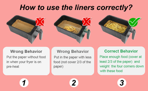 - WIDE USES: These air fryer liners for ninja can be used for baking or cooking various of food, such as chips, chicken, cakes, meat and more, perfect for home/outdoor cooking, baking, camping and party, etc . WARNING: 1. Don’t put empty paper during preheating. 2.PLACE ENOUGH FOOD to WEIGHT THE PAPER FOUR CORNERS DOWN to avoid having them fly away or get burned by the heating element