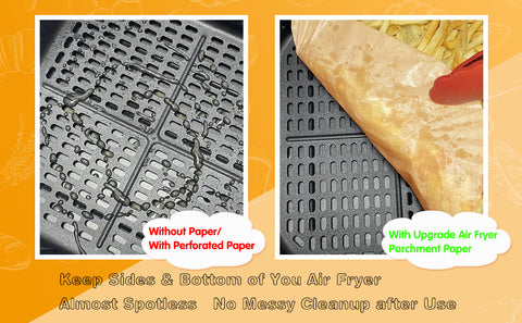 Upgrade round air fryer parchment paper with side, prevent the grease or residues to the side/bottom of air fryer, basically no cleanup after baking.