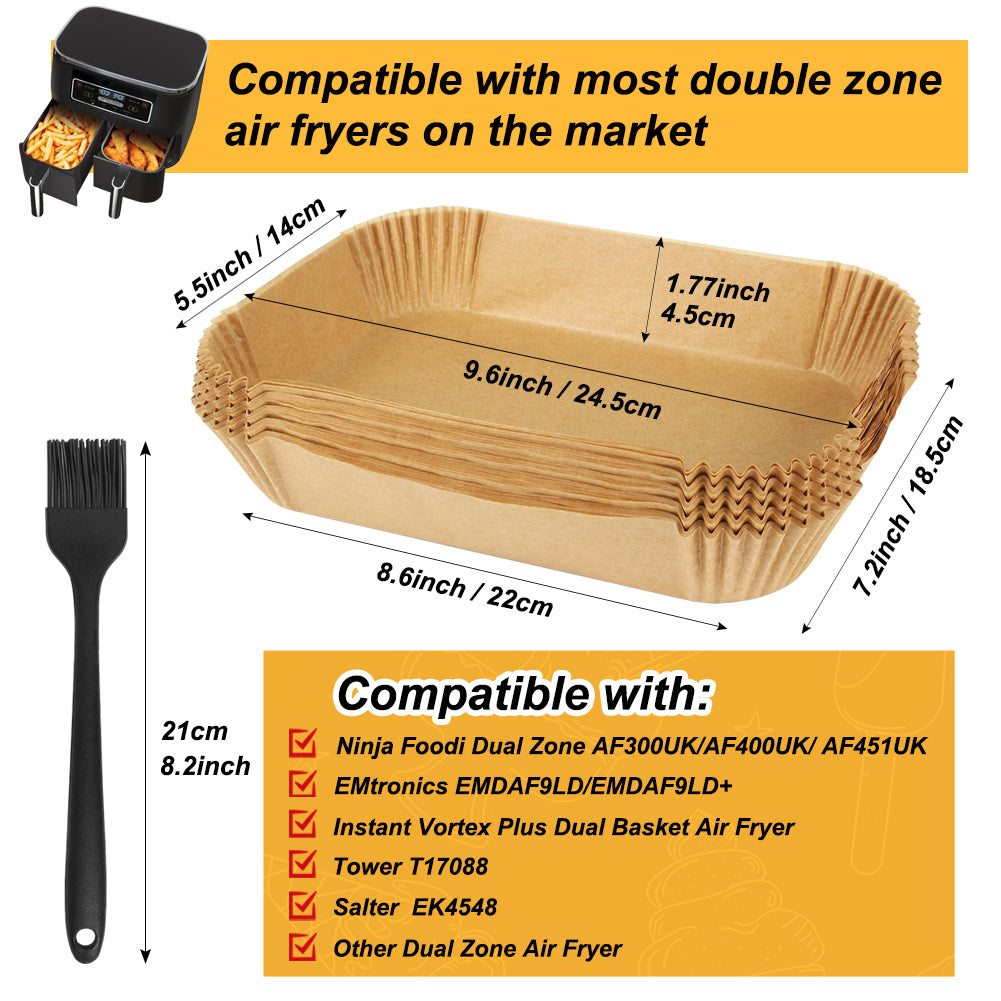 - AIR FRYER LINERS for TOWER & NINJA DUAL : The size of 120pcs air fryer liners is 13.5cm*20.5cm*4.5 cm. Especially suitable for ninja foodi dual zone AF300UK/AF400UK/AF451UK/Double Stack XL SL400UK air fryer. Also compatible with EMtronics EMDAF9LD/EMDAF9LD+, Instant Vortex Plus dual basket air fryer, Salter EK4548, Tower 17088 and more. A must have air fryer accessories for ninja dual & TOWER double air fryer