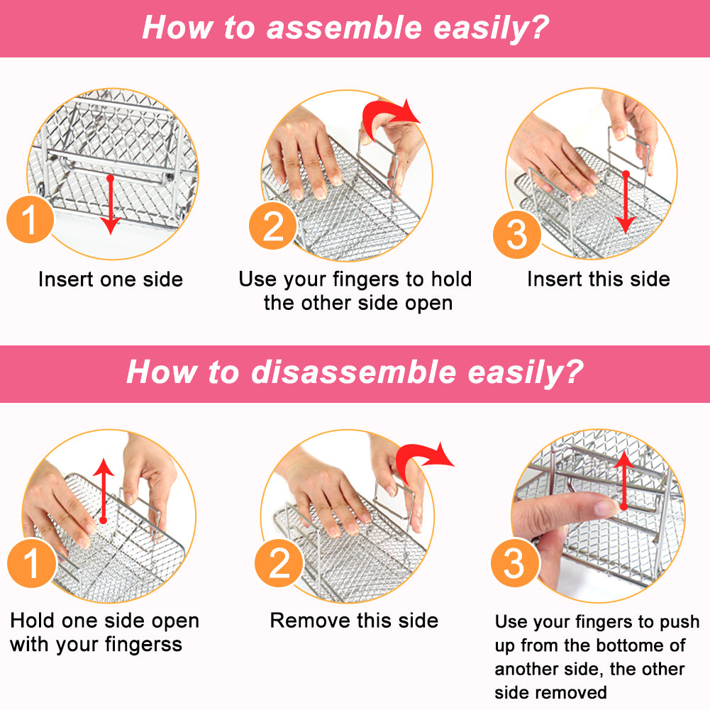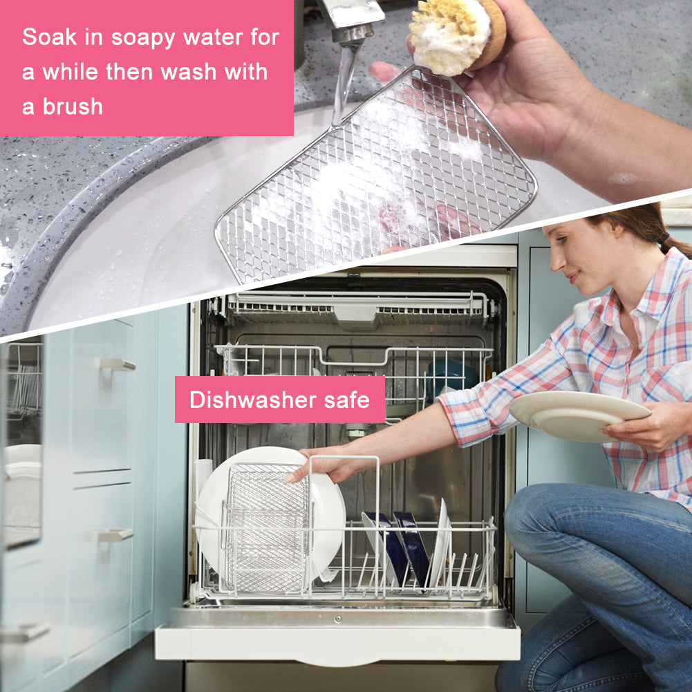 - 【High Quality Food Grade Material】 Made of high quality food grade 304 stainless steel, safe, non-toxic and durable, preventing rust and high heat resistant. Allowing you to enjoy healthy food without worries. And the edge of the air fryer rack is smooth and free of burrs, Keep your hands and air fryer safe