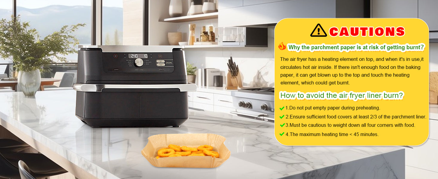 - WARNING: 1. Do not put empty paper during preheating. 2. Ensure sufficient food covers at least 2/3 of the parchment liner. 3. Must be cautions to weight down all four corners with food. 4. The maximum heating time <45mins