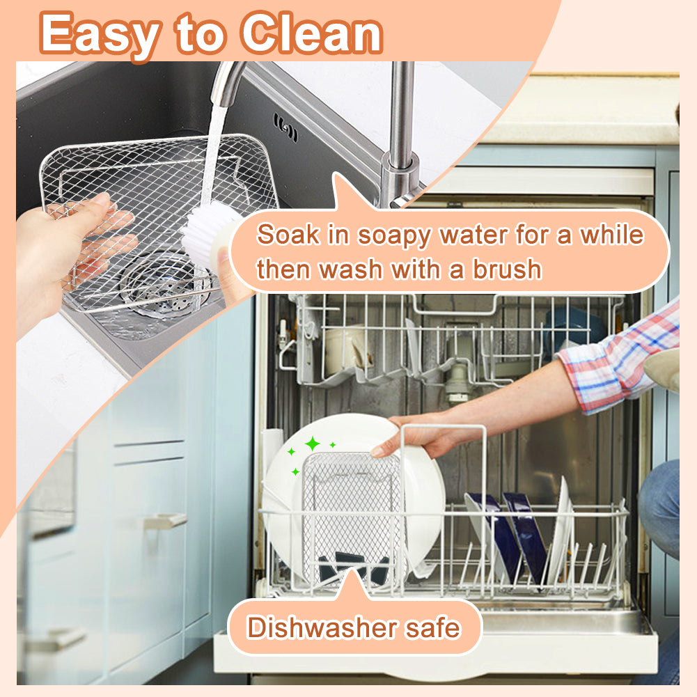- 【High Quality Food Grade Material】 Made of high quality food grade 304 stainless steel, safe, non-toxic and durable, preventing rust and high heat resistant. Allowing you to enjoy healthy food without worries. And the edge of the air fryer rack is smooth and free of burrs, Keep your hands and air fryer safe
