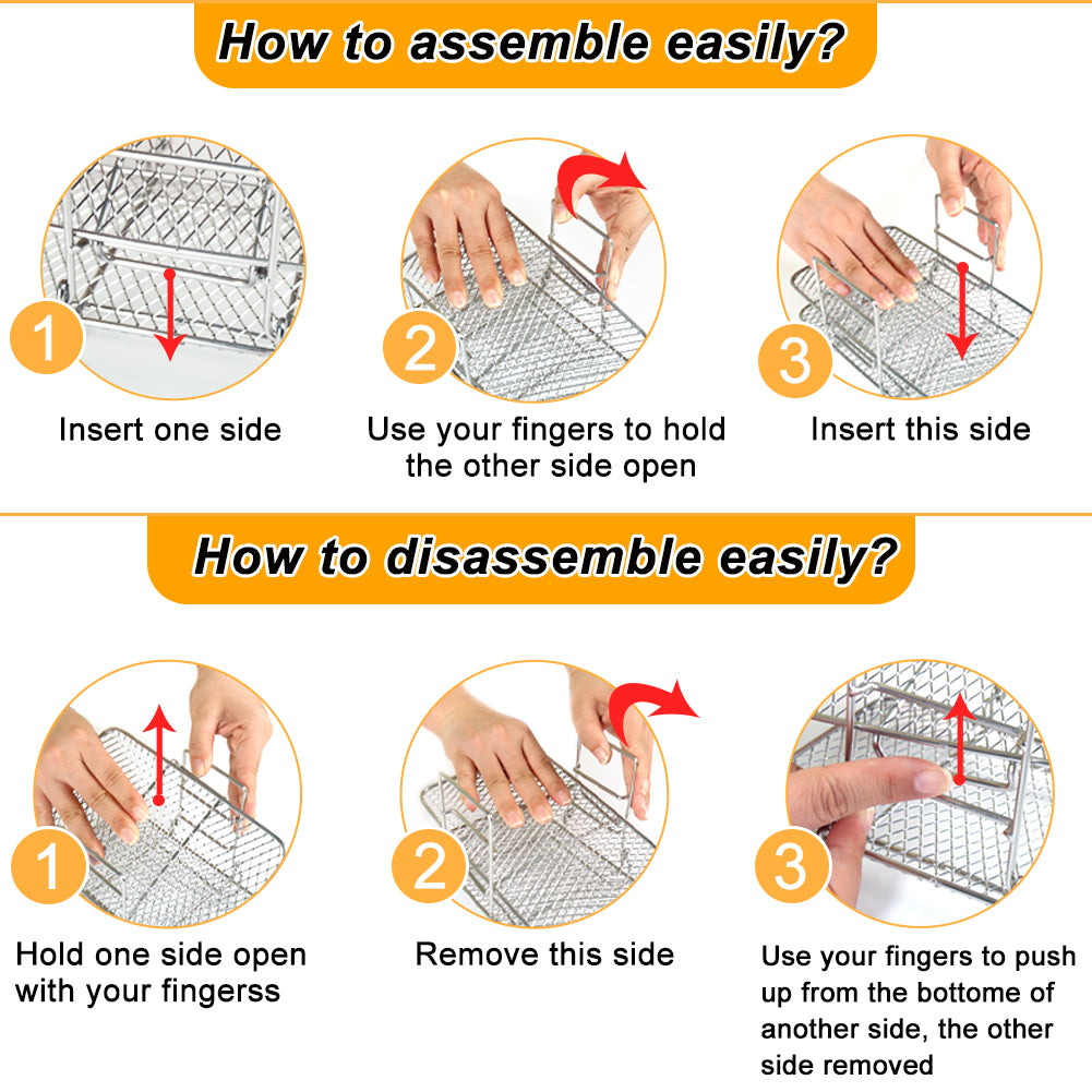 - 【Simple to Use】 Place the air fryer basket vertically before inserting the rack. Gently push the basket to avoid displacing food. Select the number of tiers according to your cooking needs for better organisation and performance