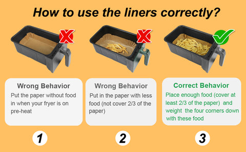 - HEAT RESISTANCE & EASY TO USE: Heat safe up to 450 degree F (232℃), Microwave and Oven safe. These disposable air fryer sheets are no need cut or fold. Just put the liners for ninja dual air fryer in the basket and then throw into a rubbish bin after use. Compared with silicone air fryer liners, air fryer paper liners are more convenient. WARNING: PLACE ENOUGH FOOD on the top of the ninja liners and WEIGHT DOWN ALL FOUR CORNERS to avoid having them fly away or get burned by the heating element