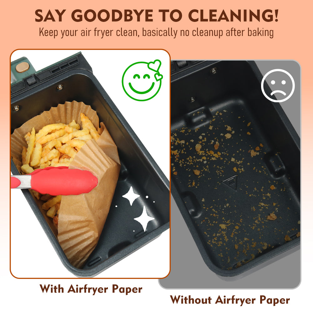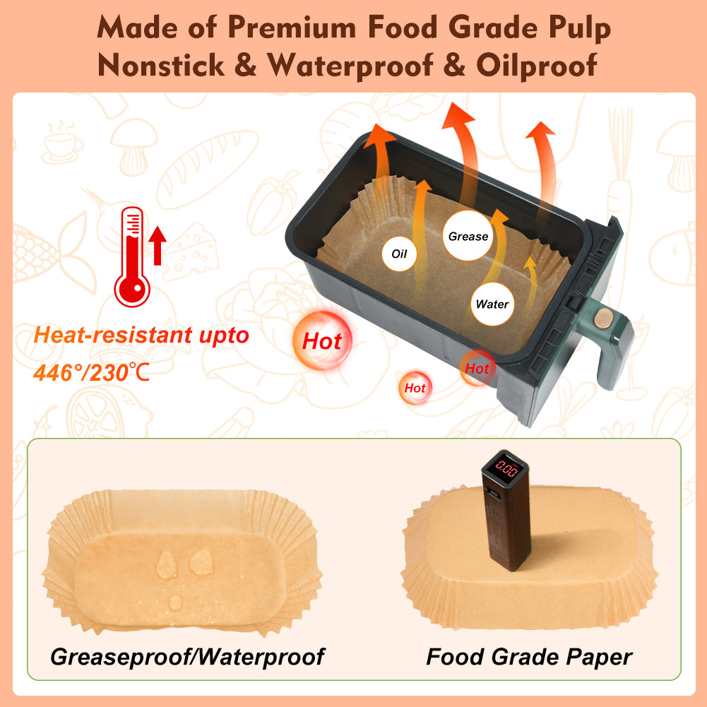 - PREMIUM AIR FRYER PAPER LINERS: Made from 100% food grade pulp with food grade nonstick coating, healthy, nonstick, grease-proof, waterproof, non-absorbent, 100% safe for daily use
