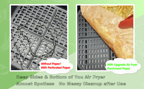 Upgrade round air fryer parchment paper with side, prevent the grease or residues to the side/bottom of air fryer, basically no cleanup after baking.
