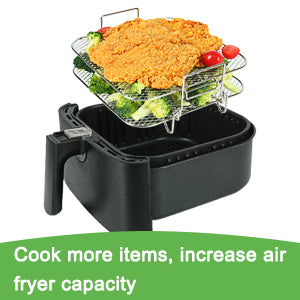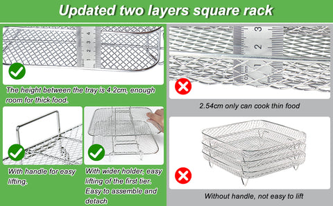 - 【Two High Layers】: Square air fryer racks with 2 tier, increase air fryer capacity and allow you cook more items one time without touching each other. And the height between the tray is 4.2cm, enough room for thick food. The grid design can achieve the best air circulation to make food crispier.