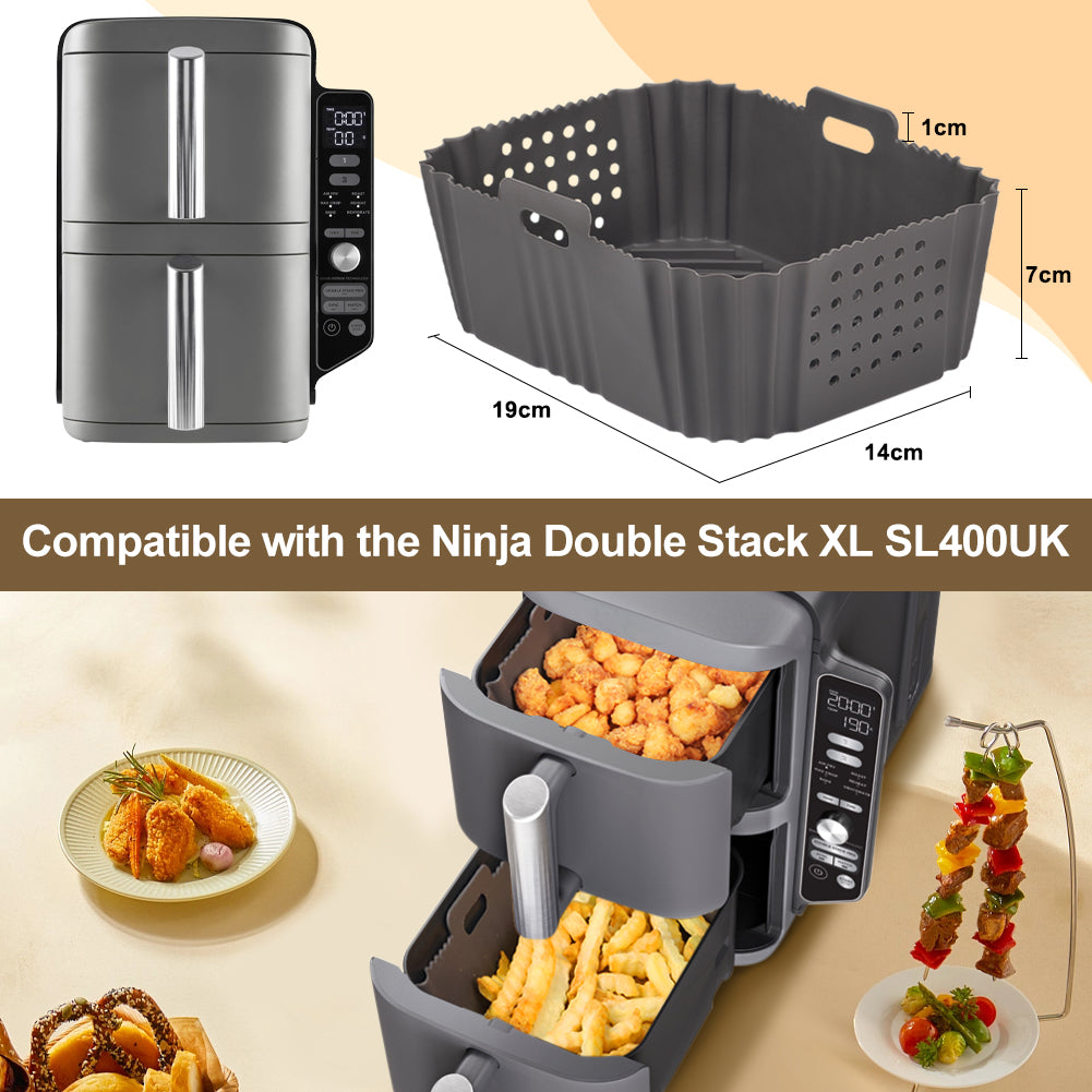 - AIR FRYER LINERS FOR NINJA DOUBLE STACK SL400UK: Special designed for the Ninja Double Stack Air Fryer XL 9.5L SL400UK. Since the hot air in the Ninja Double Stack SL400UK air fryer comes from the back, the silicone liner features perforations in both the front and back to improve airflow and ensure even baking