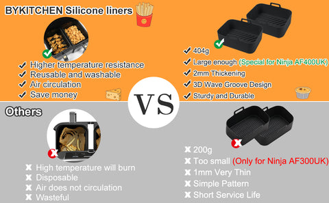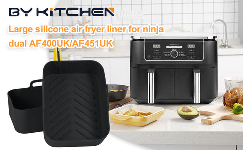 - AIR FRYER ACCESSORIES FOR NINJA DUAL ZONE: The size of enlarged silicone air fryer liner is 20cm*15cm*7 cm. Especially suitable for Ninja Dual large 9.5L AF400UK / AF451UK/Tower T17088 9L. Also Compatible with EMtronics EMAFDD9LSL 9 Liter, Instant Vortex Plus Dual, Salter EK4548, MONCOOK double air fryer, Devology Double 9L.etc