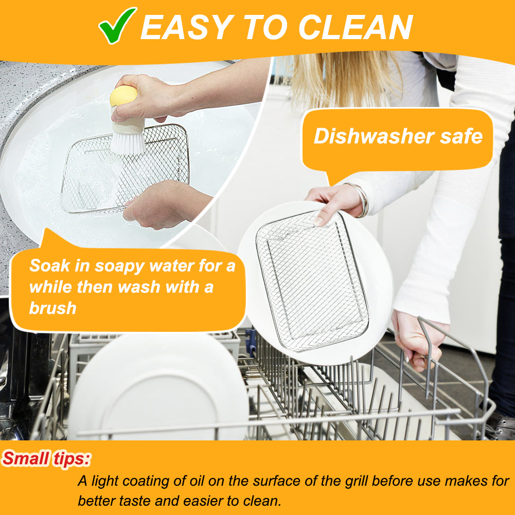 - 【304 Stainless Steel Dual Air Fryer Racks with Clip】 Made of high quality food grade 304 stainless steel, safe, non-toxic and durable, preventing rust and high heat resistant. Allowing you to enjoy healthy food without worries. And the edge of the air fryer rack is smooth and free of burrs. And with a free clip, can easily take the racks out without burning hands