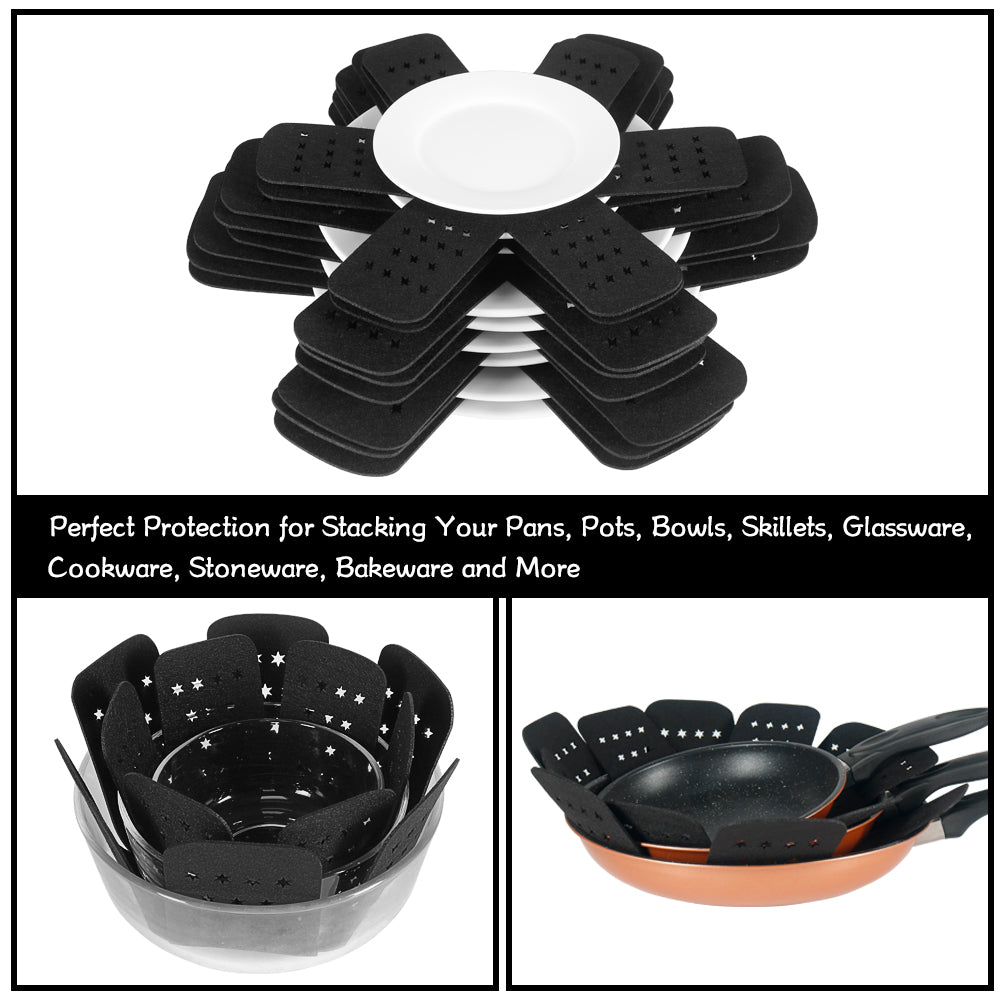 - ➤PERFECT PROTECTION FOR YOUR COOKWARE: Place pan separator pads in between pots and pans to avoid scratching and save the non-stick coating of your cookware, extend the life of your cookware. Can be also used in glassware and ceramic to avoid locking or chipping