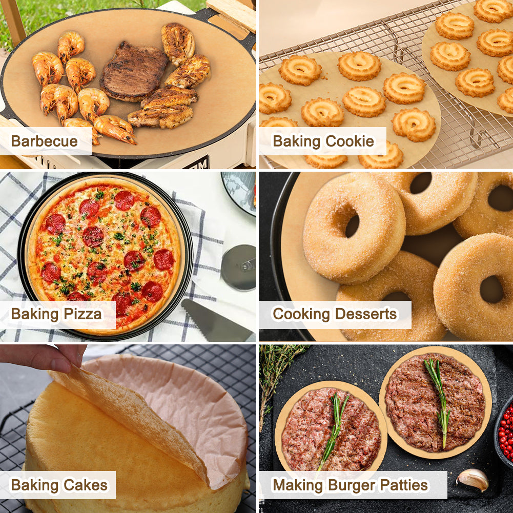 - VERSATILE USE: Beyond baking, our 10-inch parchment rounds have multiple uses, from baking cakes/pizza/cookies to barbecue. Perfect for tortilla press, quesadilla maker, roti maker, round pizza pan, pizza dough press, cake pan, springform pan, dutch oven, air fryer and more.