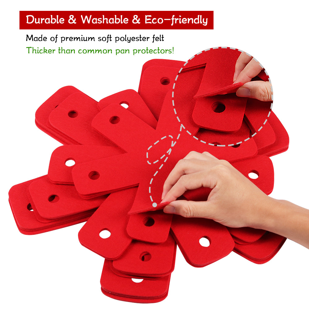 - ➤THICKER PREMIUM MATERIAL: Made of heavy duty polyester felt, durable & washable & reusable, eco-friendly and lightweight. And thicker than normal non-woven stacking pot protectors, thick enough to prevent your any pans or pots from getting damaged.