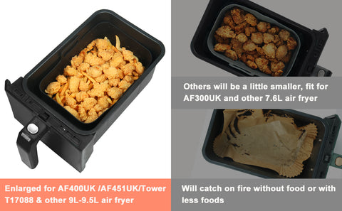 - LARGE SILICONE AIR FRYER LINER FOR NINJA DUAL ZONE: The size of air fryer silicone pot is 20.5cm*13.5cm*7 cm. Especially suitable for 8.2L-9.5L Large Dual Air Fryer. Like Ninja Foodi Dual Zone AF451UK / AF400UK, Tower T17088 9L, Instant Pot Vortex Plus 8.5L XL Dual Air Fryer, Salter EK4548, EMtronics/Devology Dual Air Fryer and More