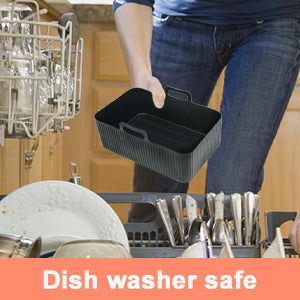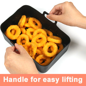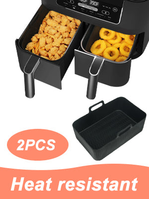 - EASY TO USE & EASY TO CLEAN: Our silicone air fryer liner for dual basket is designed with handles on both sides to make transferring the food to plate easier. Our silicone rectangle air fryer liner is soft and flexible. And please place the silicone liners in warm soapy water immediately you remove food and after soaking, flipping the inside out, use brush to get off the stubborn bits. It's also dishwasher safe