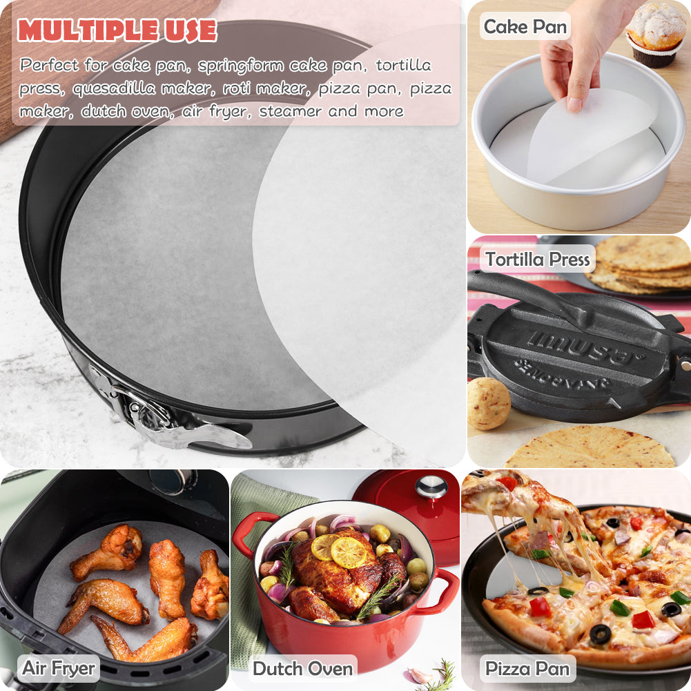 - PREMIUM QUALITY: Our baking parchment circles are designed with food grade pulp, 100% safe for daily use. Heat resistance up to 446 ℉ /230 ℃, perfect for toaster oven, tortilla press, cheesecake pan and so on.